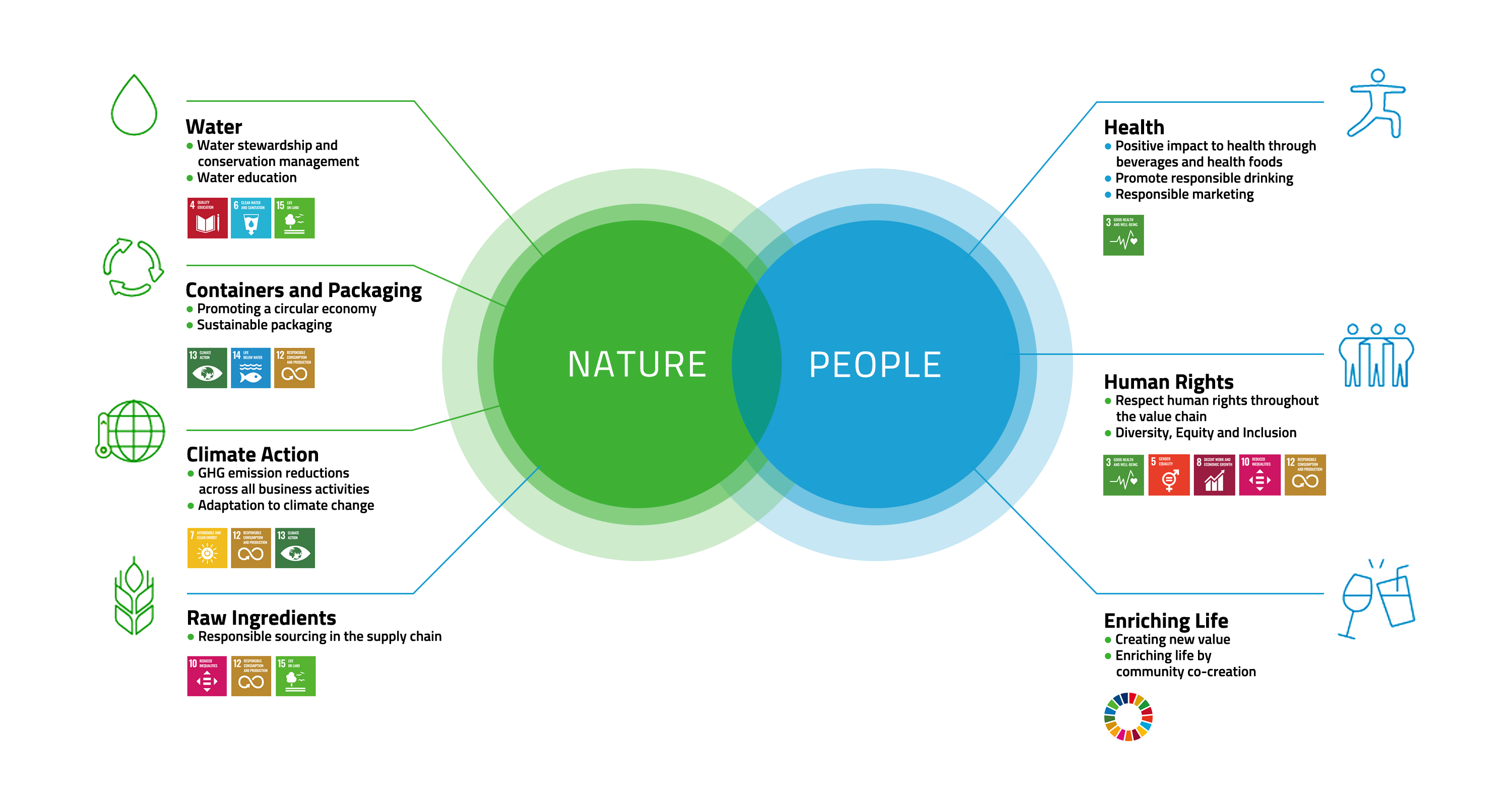 ในฐานะบริษัทเครื่องดื่มที่มีความหลากหลาย เราทุ่มเทให้กับการสร้างสังคมที่ยั่งยืน ด้วยการยกระดับชีวิตของผู้คนและอนุรักษ์สิ่งแวดล้อมทางธรรมชาติไปพร้อม ๆ กัน เราเคารพต่อธรรมชาติที่ผลิตภัณฑ์ของเราพึ่งพา และดำเนินกิจกรรมต่าง ๆ เพื่อส่งเสริมความยั่งยืนของการใช้ทรัพยากรธรรมชาติและการดำรงวัฏจักรของน้ำ นอกเหนือจากการมอบสินค้าและบริการที่เติมเต็มชีวิตของผู้คนแล้ว เรายังยึดมั่นที่จะสนับสนุนให้การเติบโตทางธุรกิจของบริษัทช่วยสร้างสังคมที่ยั่งยืนตลอดห่วงโซ่คุณค่าของเรา